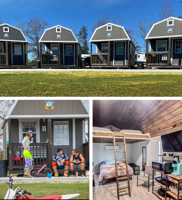 Our cozy cabins offer everything you need for a great stay at our track. Conveniently located in the middle of the facility, these cabins are a perfect spot for riders and their guests to enjoy the track with all the comforts of home.